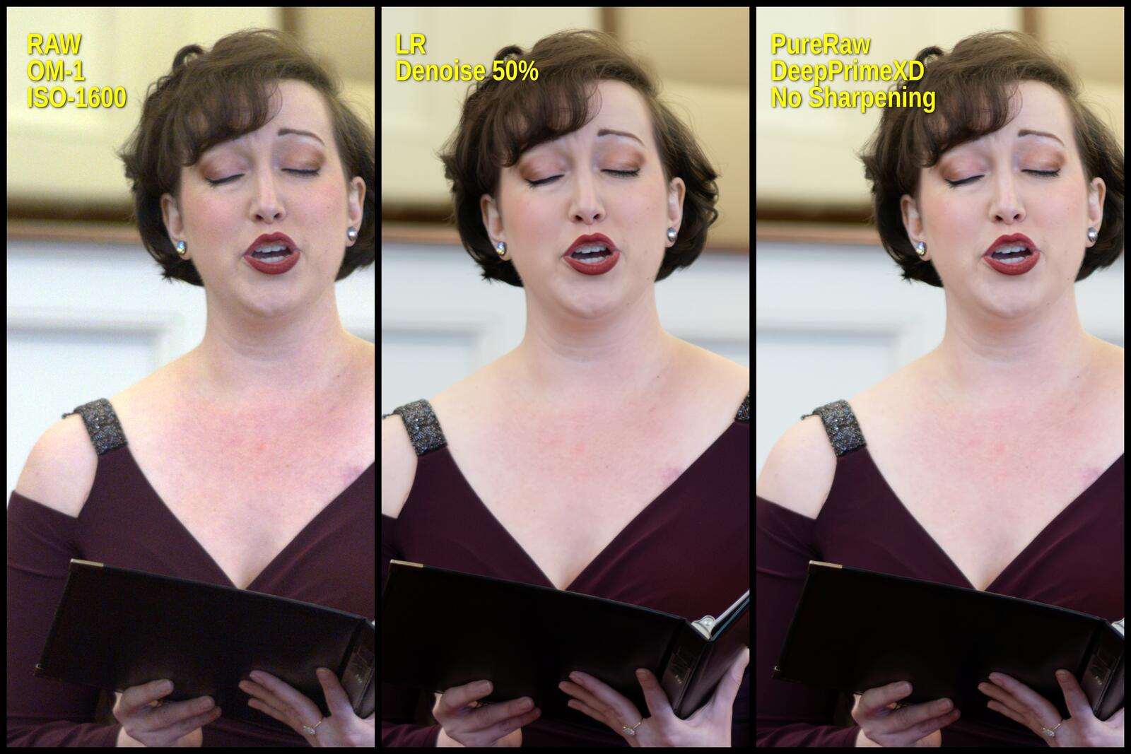 For the woman, I used regular DeepPrime. DeepPrimeXD was a mess. It oversharpened and created lots of false details.