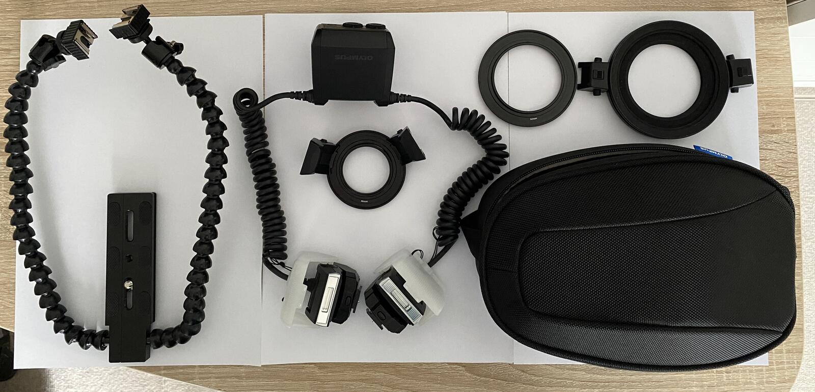 Included with it are the Olympus SR-1 Shoe ring which has the 72mm lens mount. (Enabling you to use the 12-100 f4 or the 40- 150 f2.8 lenses). Also a flexible universal duel twin flash mount bracket with arca foot release plate.