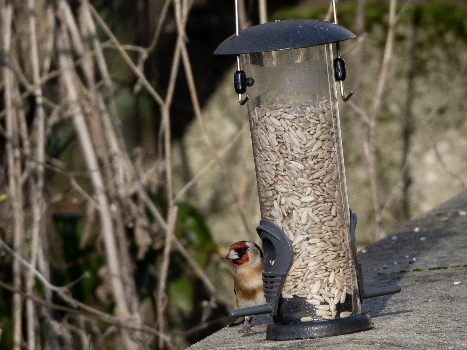 I have had this niger seed bird-feeder for some time but it didn't work in the garden in Hemel Hempstead because we hardly ever saw any goldfinches. Here in France, however, there are regular visits from goldfinches as long as the sunflower kernel feeder is stocked!