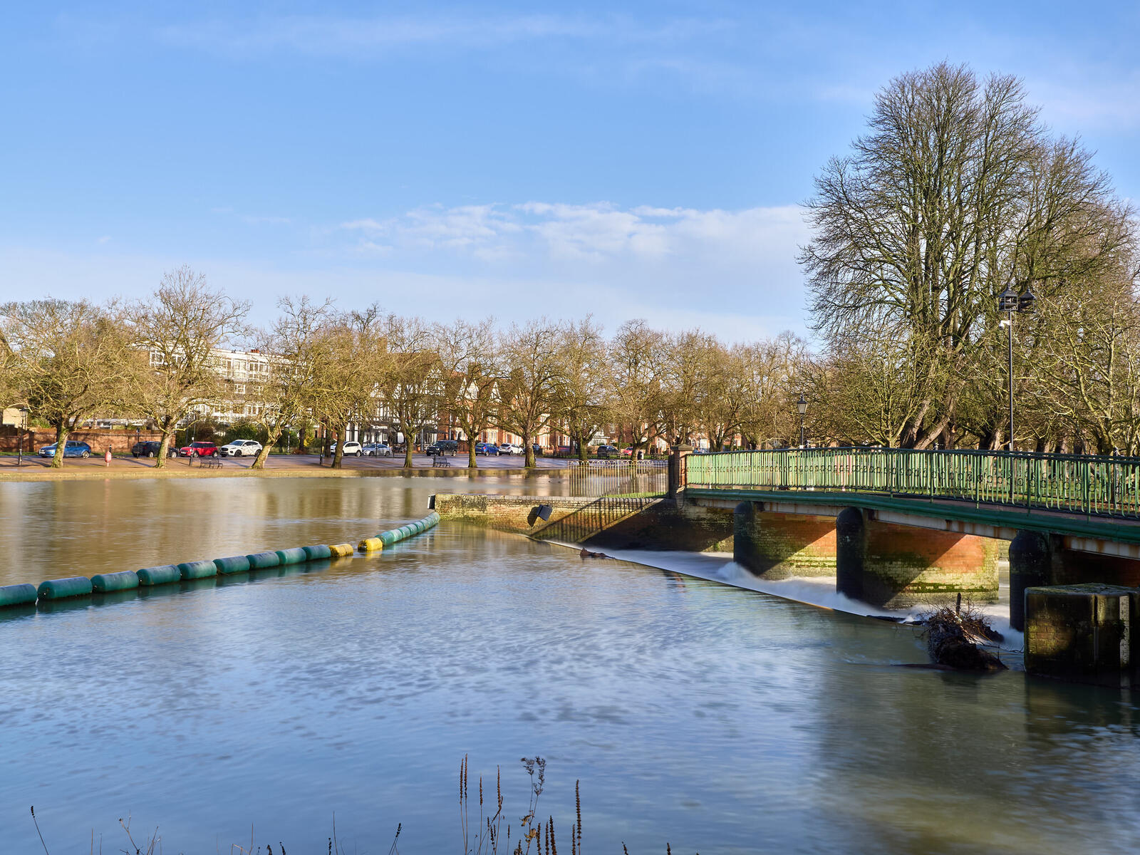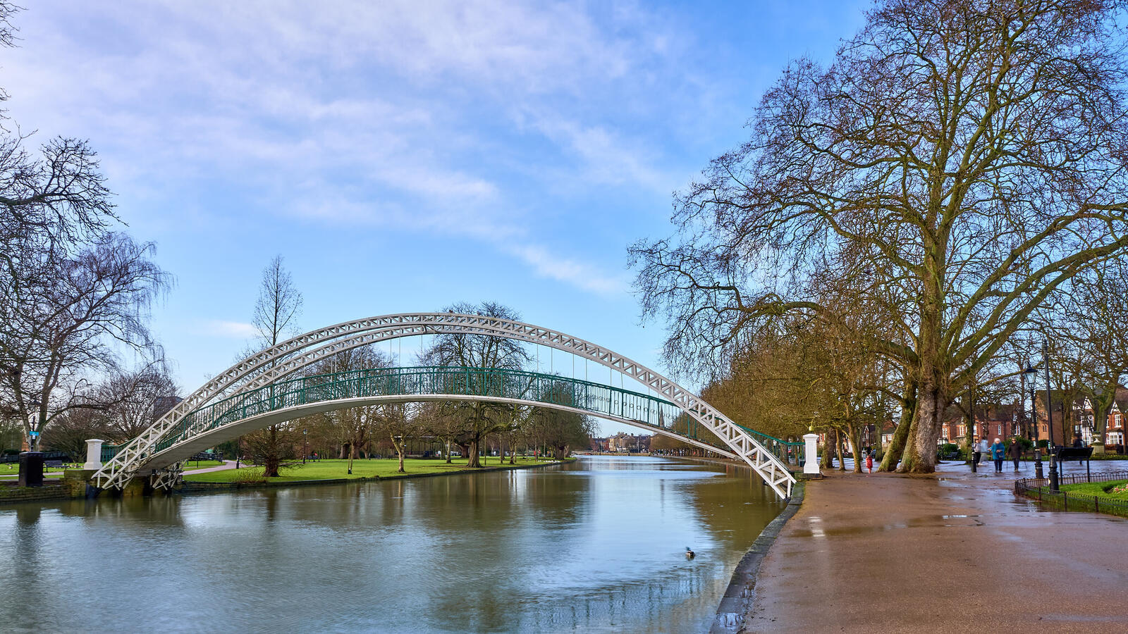 The river divides around some islands called Mill Meadows and Longholme. This one is a pedestrian bridge crossing near the weir. I think it's called Abbey Bridge.