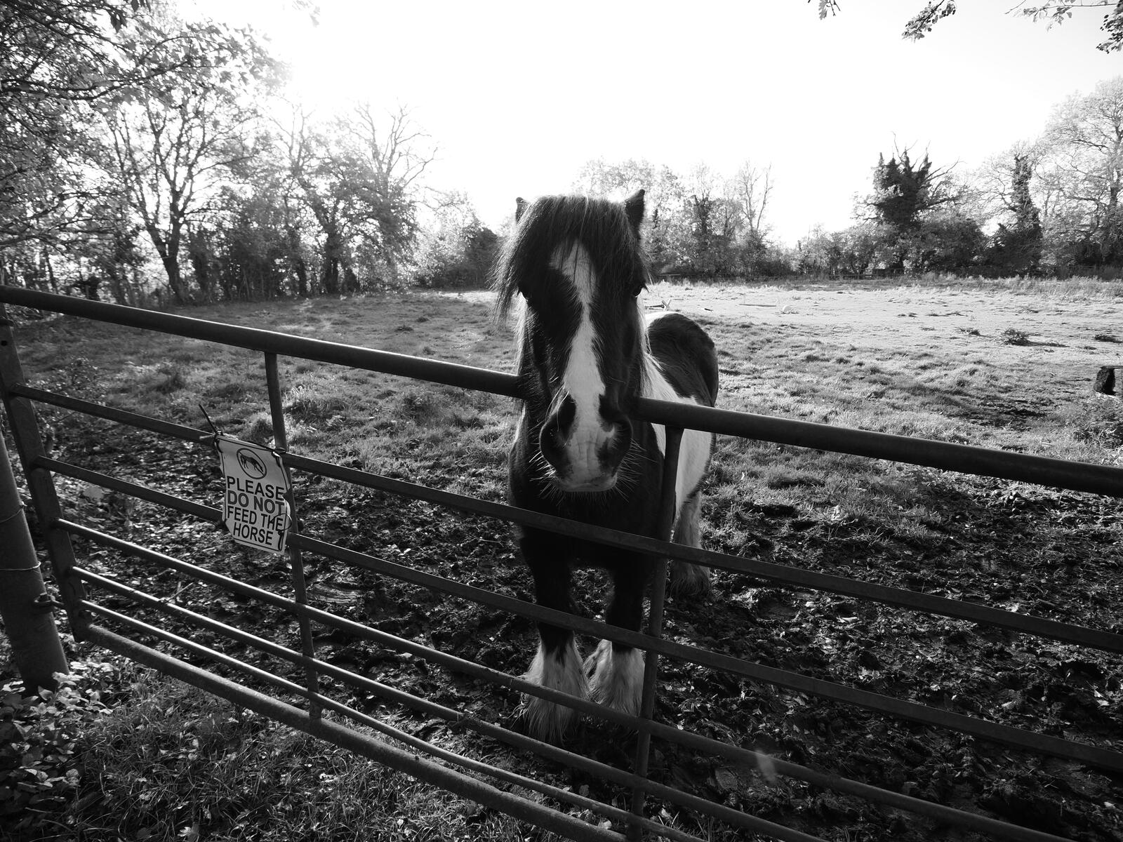 I'm told the black and white horse is called Spud. He often comes up to the gate to greet me, I took photos of him in B&W mode and didn't feed him anything!