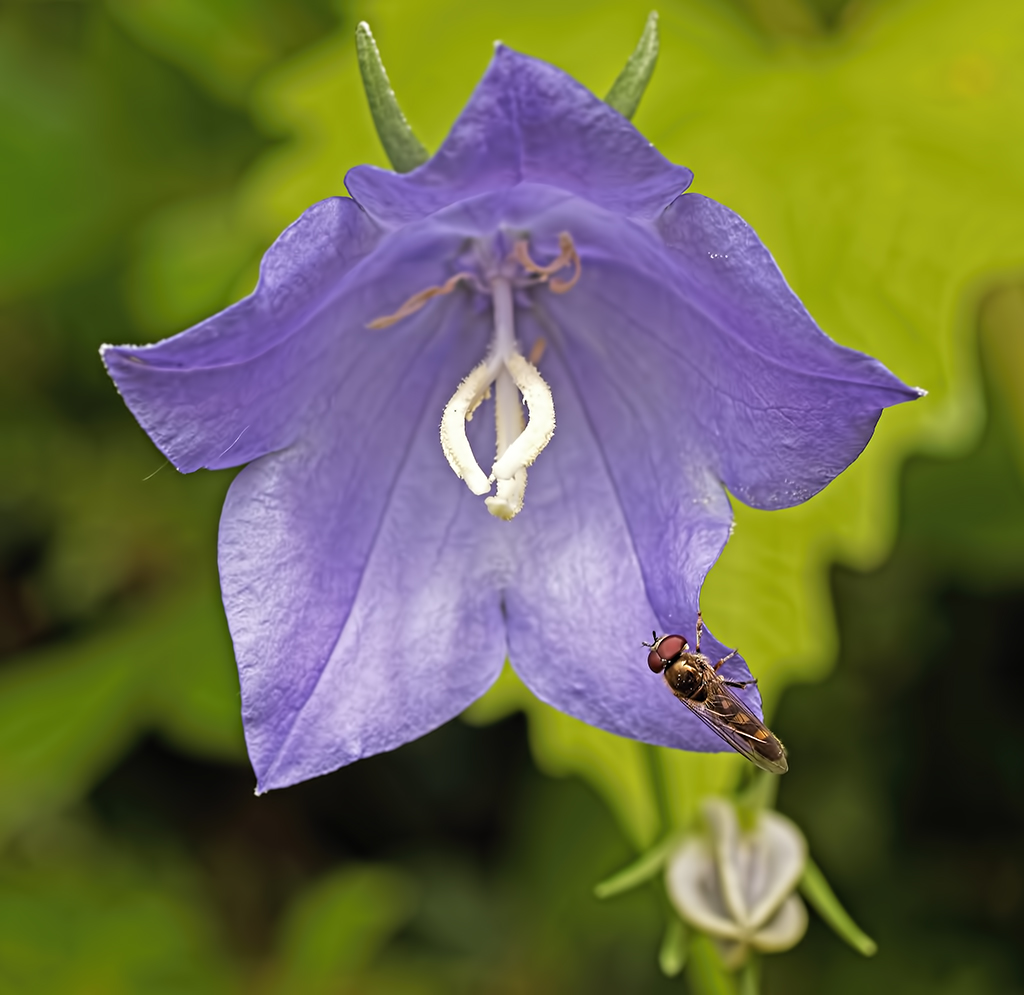 I passed by this flower several times on my way to photograph insects in my garden. This image was intended to be one of a stereo pair but the Marmalade Hoverfly was there only for this one frame.