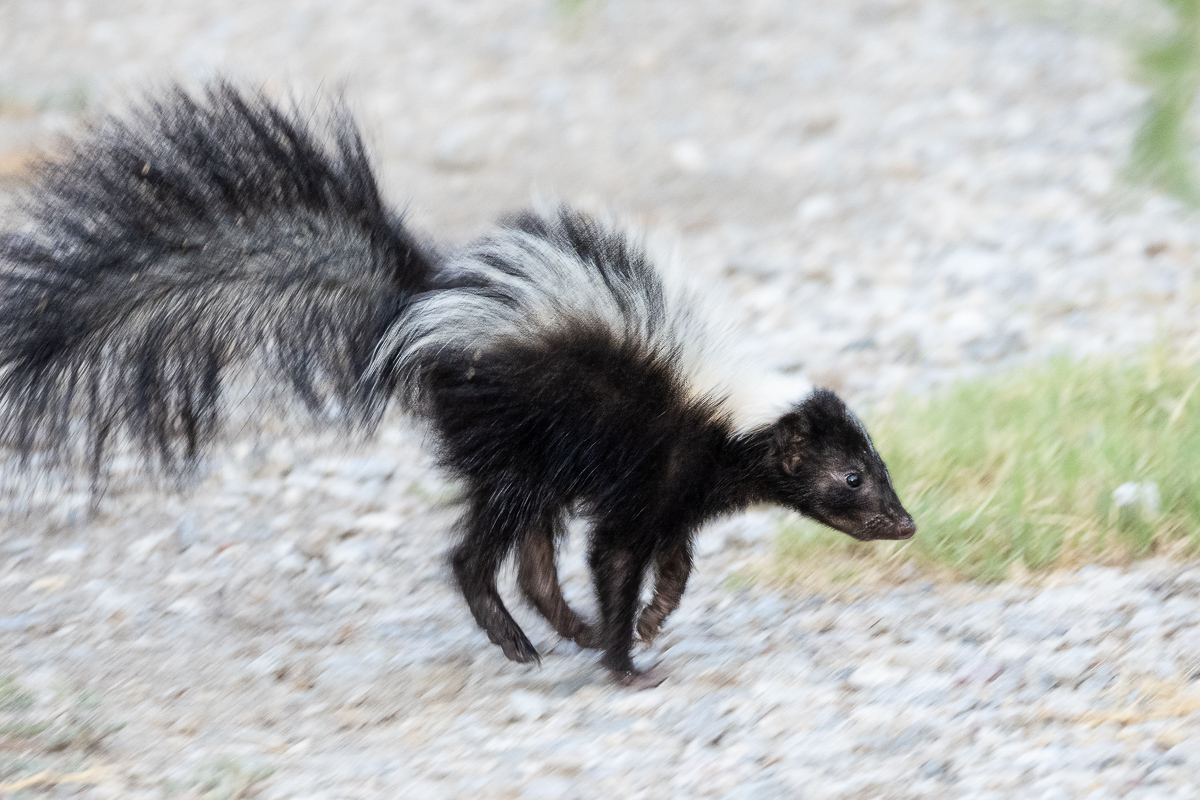 Literally stumbled over this little guy on my morning walk. Ran away. Once I was 'out of range' I managed to turn around and grab a couple of shots as it bounced off into the tall grass. Somehow, I managed to get the eye in focus on this one image. The shaky quality definitely reflects my feelings about skunks.