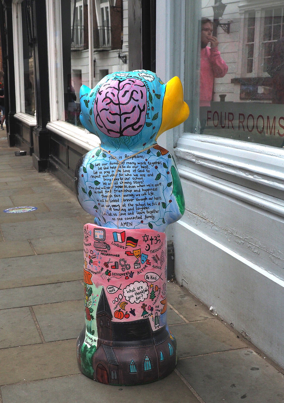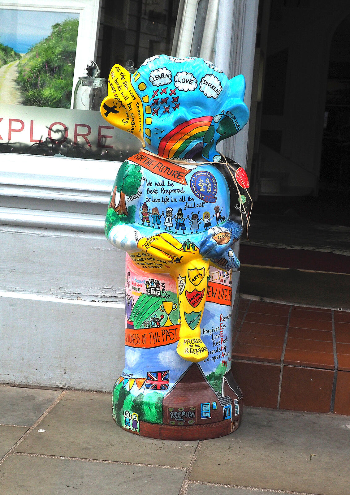 Another, outside an art gallery in the Cathedral Quarter. It is one of the smaller 'Educational imps' given to local schools to decorate. This one is from Reepham Primary School and was painted by the Headmistress.