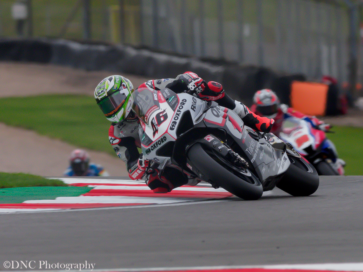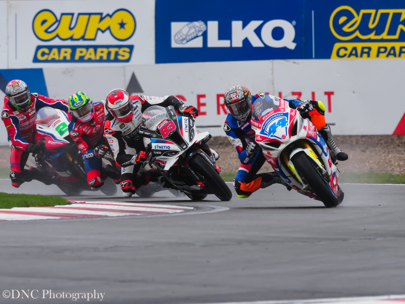 Nine riders crashed out of Twenty Four starters, it was very slippery. It is often blamed on aviation fuel as the glide path for East Midlands airport goes straight over the circuit.