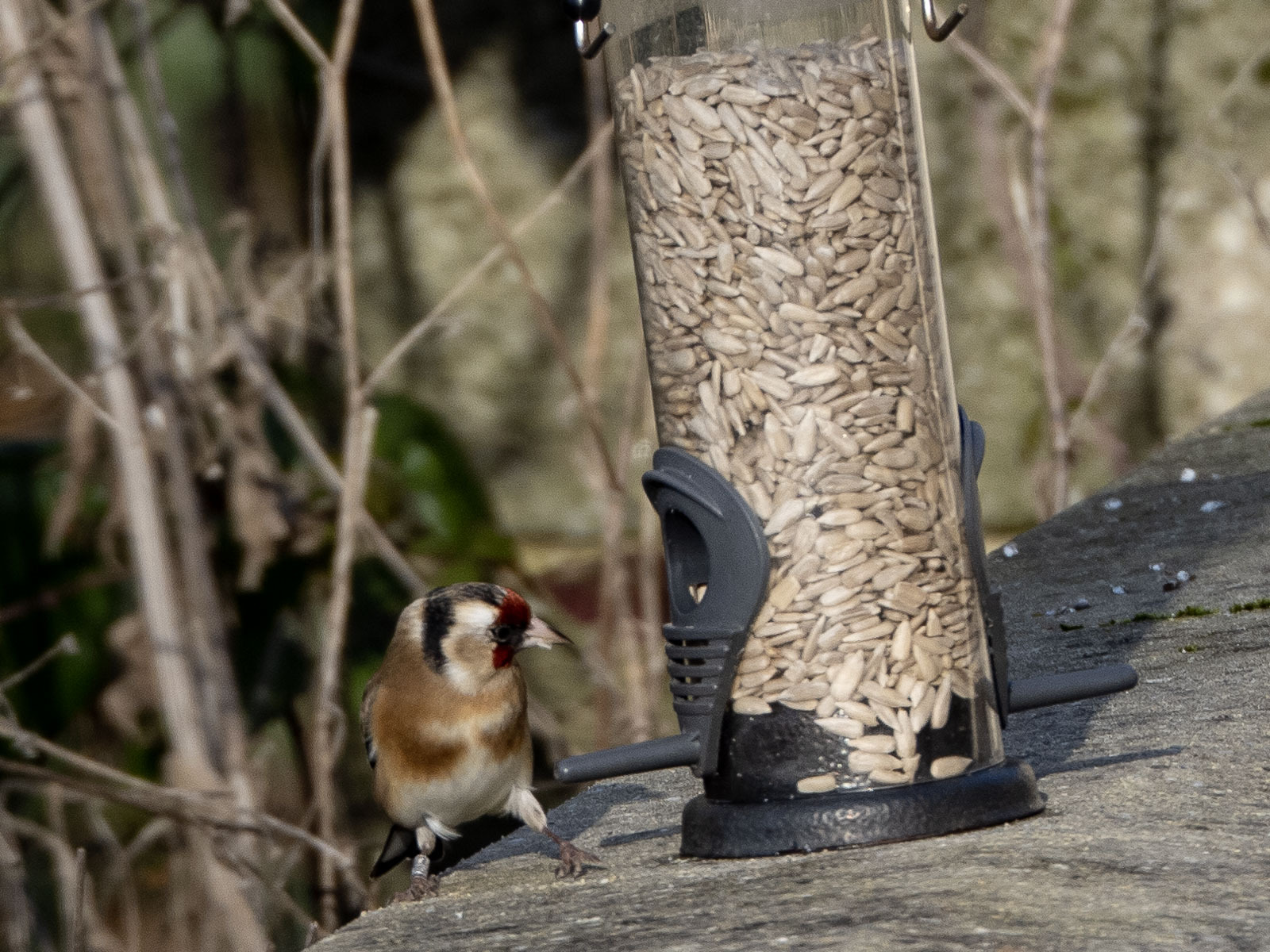 The good news is that the goldfinches here quickly found the new feeder but they do also like sunflower hearts very much. Here's the evidence: