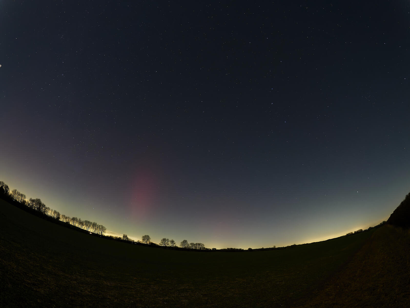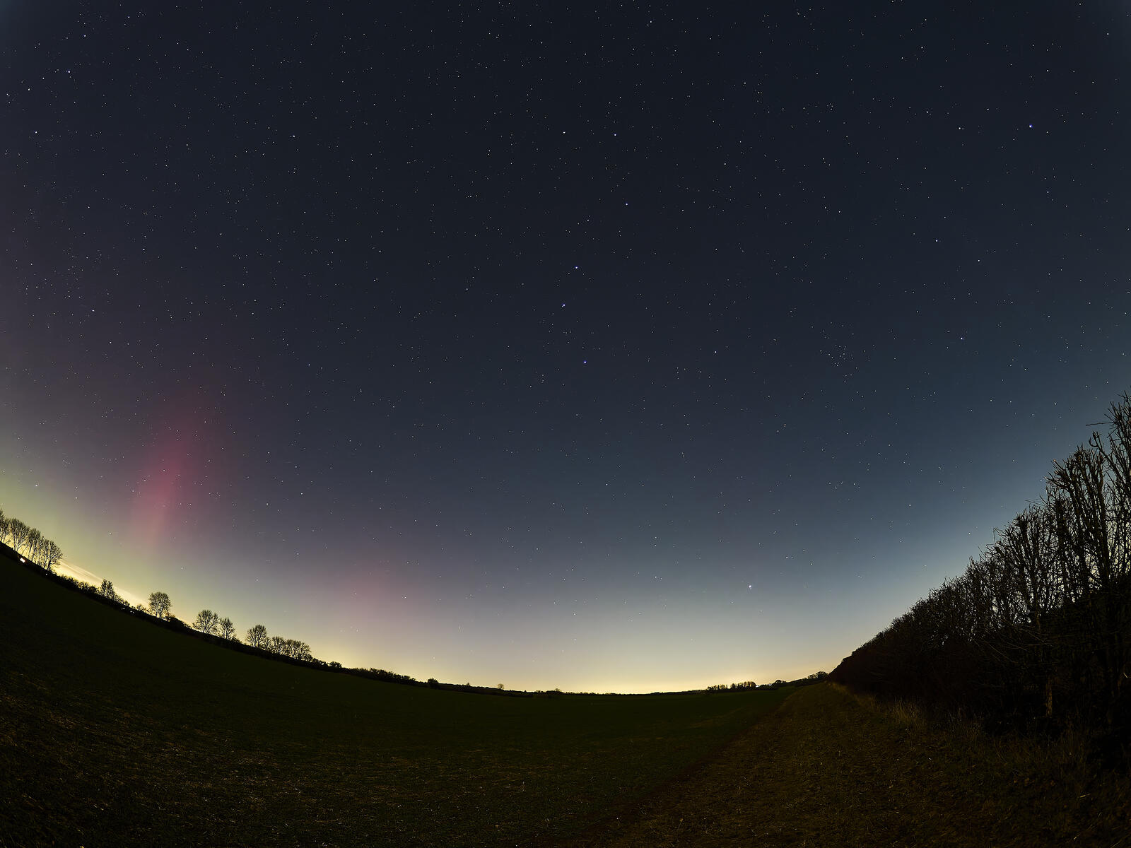 I couldn't see any evidence of aurora with my eyes and the moon was making things quite bright. I took a couple of shots with the OM-1 and 8mm f1.8 Fisheye thinking I could at least try some astro shots. The first shot showed a pink pillar clearly visible! I pointed the camera more to the north and took some more shots but after about 10 minutes the aurora had faded. The sky glow in my shots is probably from Cambridge about 13 miles distant in the direction of he hedge line - also St Neots and Huntingdon are not far away.