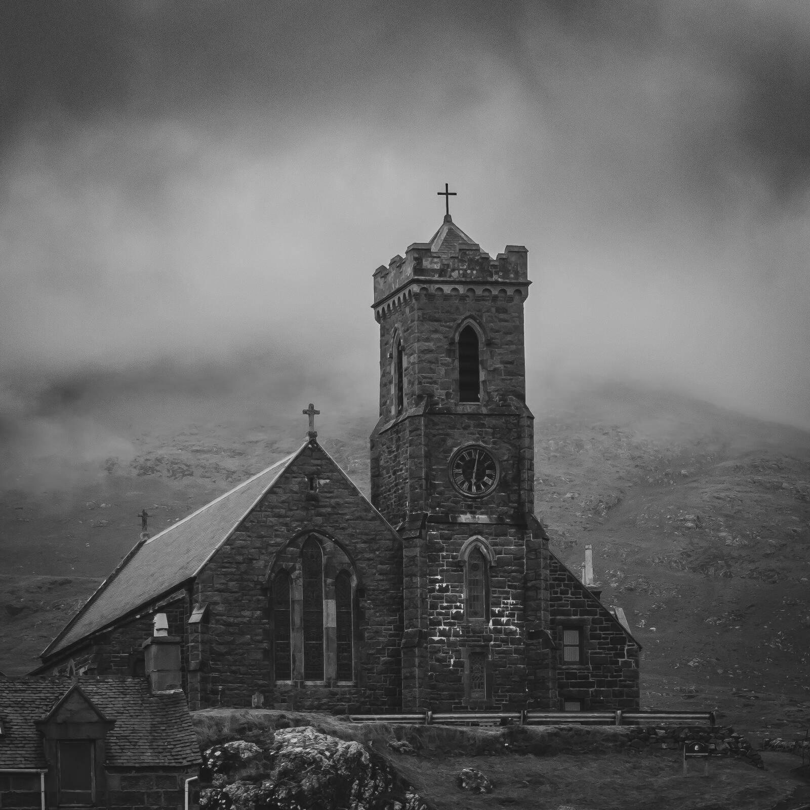 The church of Our Lady Star of the Sea in Castlebay, Barra with mist rolling down from Heaval in the background