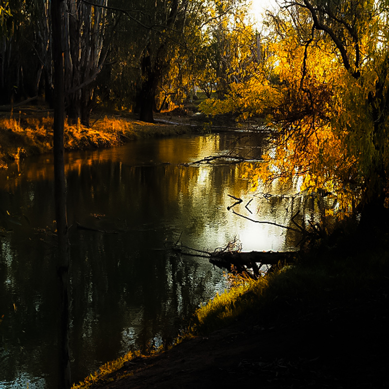 To my eye the composition could be improved significantly by stepping in front of that dark and intrusive tree trunk on the right. It acts as a barrier to the eye progressing to the most important part of the scene - the golden lit tree behind. You also need to lose that patch of bare earth in the foreground and I'm also uncomfortable with that virtually straight tree and it's reflection on the left - it looks almost like a telegraph pole and seems out of place.
